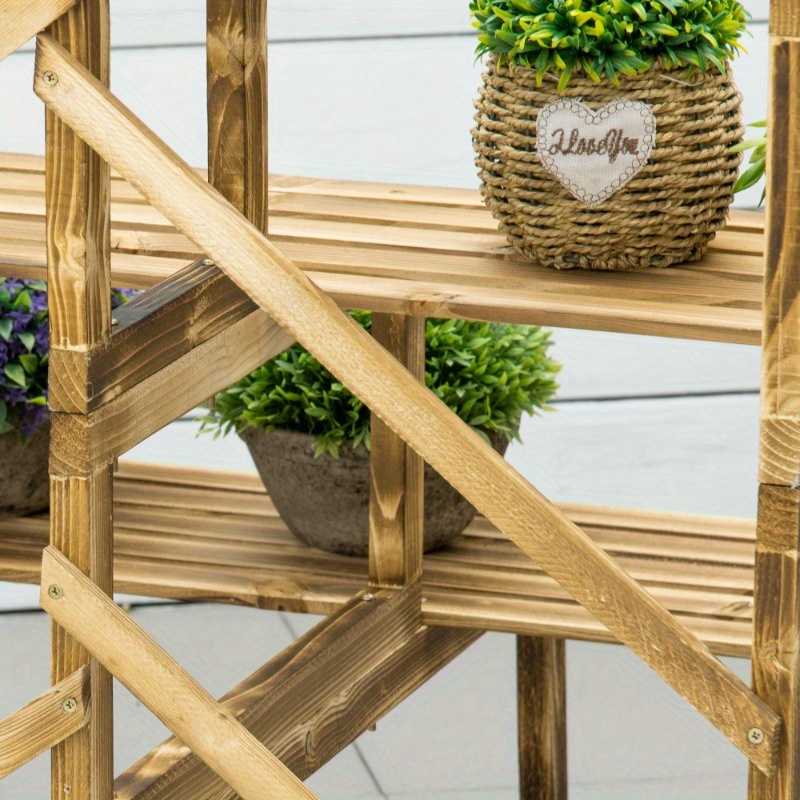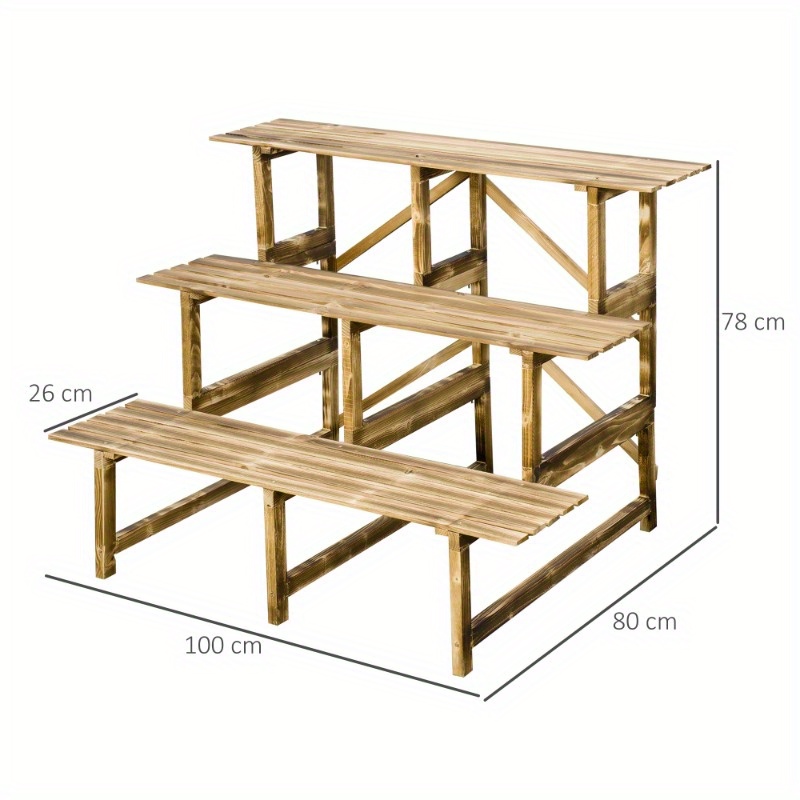 Esta estantería de madera de tres alturas está diseñada para soportar diferentes tipos de plantas, incluidos bonsáis, flores y macetas decorativas. Fabricada en madera maciza carbonizada, ofrece resistencia adecuada a la intemperie, manteniendo estabilidad y durabilidad en ambientes húmedos o soleados. Su diseño vertical optimiza el espacio, ideal para balcones, terrazas o interiores con espacio limitado. Los múltiples niveles permiten organizar plantas según tamaño y exposición a la luz, facilitando cuidados diferenciados. Apta para usuarios que buscan una solución elegante y práctica para distribuir plantas en espacios diversos.