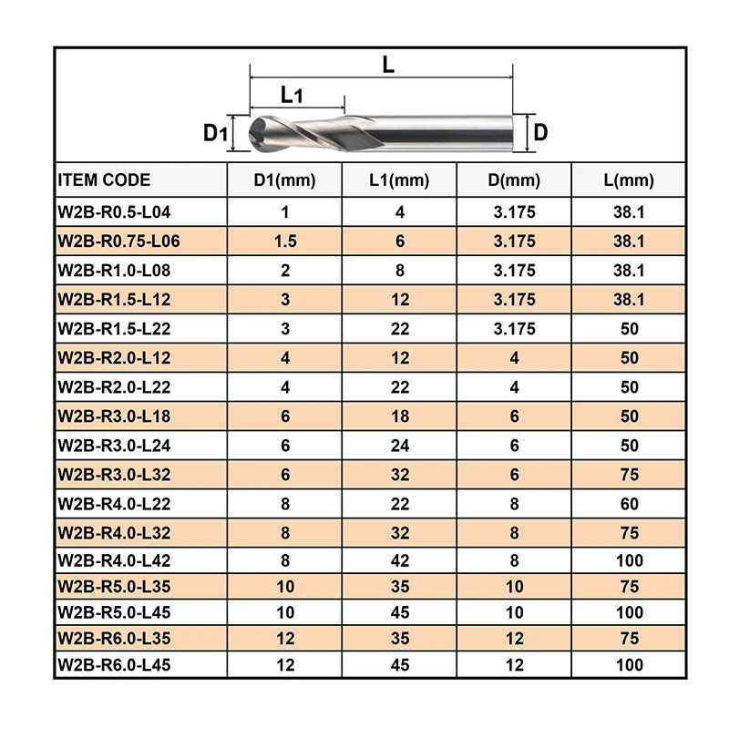 🎯 Punta esférica R0.5–R4.0, perfecta para ranuras, tallado 3D y acabados curvos.
