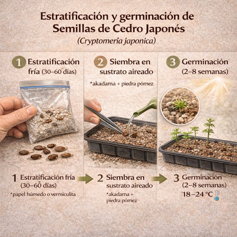 Las semillas de Cryptomeria japonica (cedro japonés) se utilizan para cultivar cedro ornamental o bonsái. Se recomienda estratificación fría de 30–60 días antes de la siembra en sustrato aireado, con luz y humedad controlada.